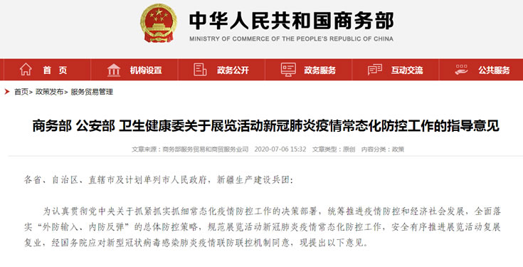 2020年7月3日,三部委(商務(wù)部、公安部、衛(wèi)健委)對疫情下的展覽活動提出詳細(xì)的指導(dǎo)意見,7月6日在商務(wù)部網(wǎng)站公布,這可謂一石激起千層浪,為會展產(chǎn)業(yè)的全面復(fù)蘇帶來了真正福音。確切地說,這可以理解為2020年會展業(yè)真正復(fù)蘇的開端,意味著相應(yīng)的一些審批程序?qū)⒃趯徤鞯姆諊谐掷m(xù)往前,這也意味著會展業(yè)前期的一些積極準(zhǔn)備將進入開拔階段。