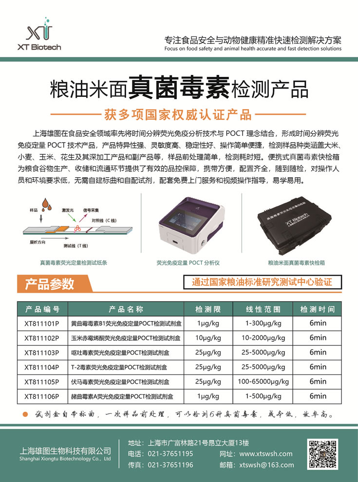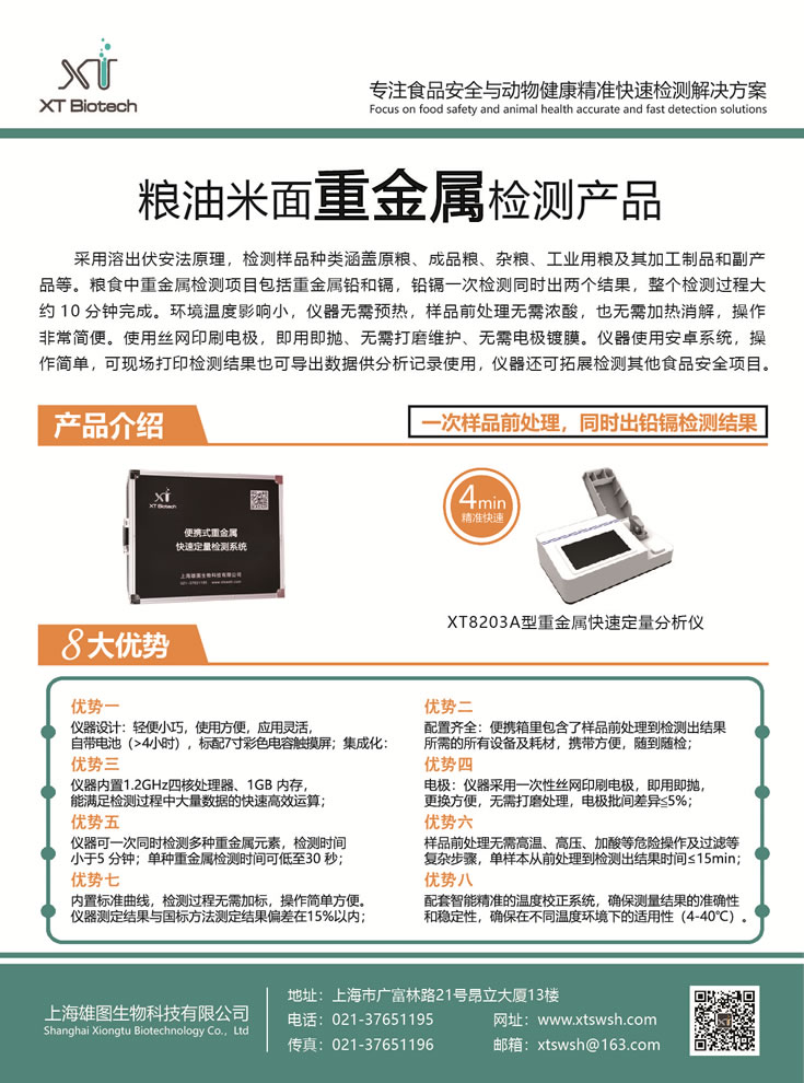 上海雄圖生物科技有限公司是專注為食品安全與動物健康領(lǐng)域內(nèi)提供精準(zhǔn)快速檢測解決方案的高科技創(chuàng)新型企業(yè),自主開發(fā)的真菌毒素與藥物殘留熒光免疫定量POCT檢測系統(tǒng)、重金屬快速定量檢測系統(tǒng)、非洲豬瘟病毒等動物疾病熒光定量PCR快速檢測系統(tǒng)等,主要用于糧油米面、飼料、肉蛋奶制品生產(chǎn)加工和畜禽水產(chǎn)養(yǎng)殖行業(yè)及其監(jiān)管流通行業(yè)。