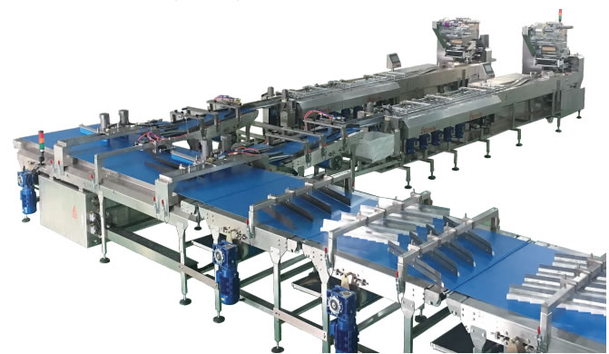 功能與特點(diǎn):蛋卷無托理料包裝線由供料帶、圓盤整理機(jī)、自動(dòng)理料機(jī)組、尾架以及包裝機(jī)組成,利用圓盤整理機(jī)的離心力, 對蛋卷進(jìn)行整理,并有序地送進(jìn)自動(dòng)理料機(jī)組進(jìn)行定位包裝。