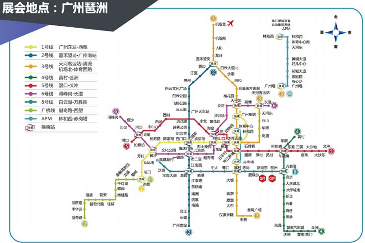 地鐵:3號線(北延長線)機場北站(2號航站樓)/機場南站(1號航站樓)- 體育西路站(轉(zhuǎn)乘3號線) - 客村站(轉(zhuǎn)乘8號線)- 新港東站A出口(廣交會展館A區(qū))。