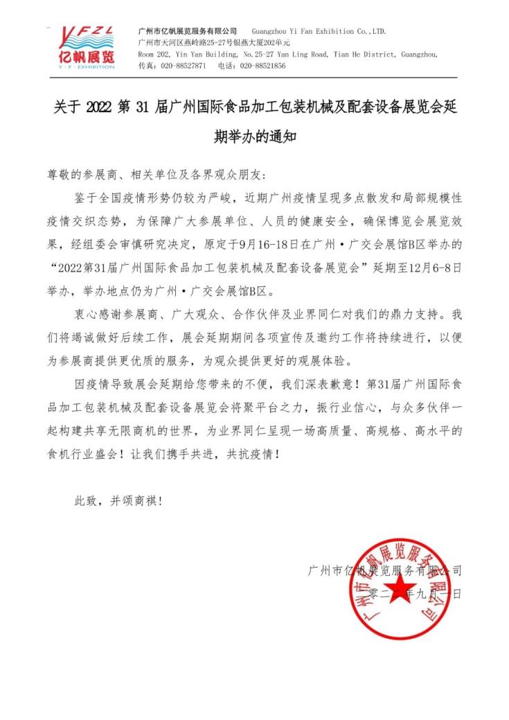 鑒于全國疫情形勢仍較為嚴峻,近期廣州疫情呈現(xiàn)多點散發(fā)和局部規(guī)模性疫情交織態(tài)勢,為保障廣大參展單位、人員的健康安全,確保博覽會展覽效果,經(jīng)組委會審慎研究決定,原定于9月16-18日在廣州·廣交會展館B區(qū)舉辦的“2022第31屆廣州國際食品加工包裝機械及配套設(shè)備展覽會”延期至12月6-8日舉辦,舉辦地點仍為廣州·廣交會展館B區(qū)。