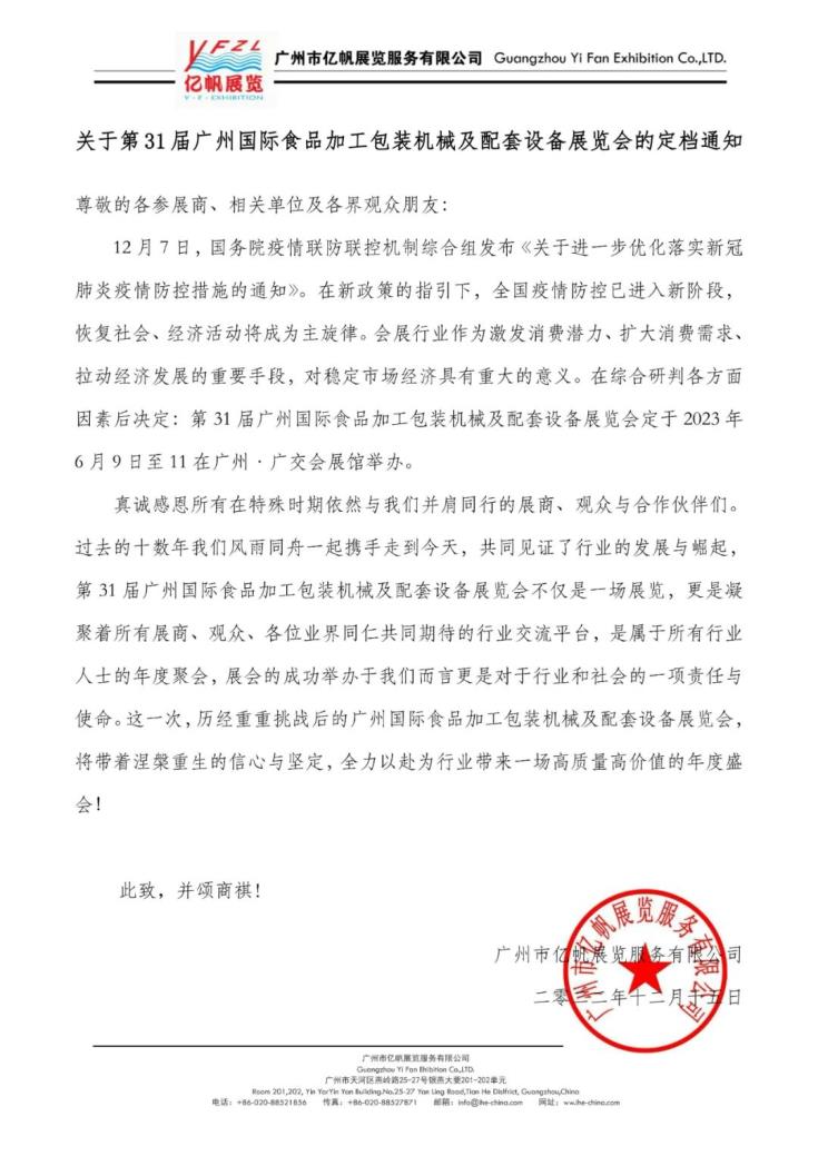 12月7日,國務(wù)院疫情聯(lián)防聯(lián)控機(jī)制綜合組發(fā)布《關(guān)于進(jìn)一步優(yōu)化落實新冠肺炎疫情防控措施的通知》。在新政策的指引下,全國疫情防控已進(jìn)入新階段,恢復(fù)社會、經(jīng)濟(jì)活動將成為主旋律。會展行業(yè)作為激發(fā)消費(fèi)潛力、擴(kuò)大消費(fèi)需求、拉動經(jīng)濟(jì)發(fā)展的重要手段,對穩(wěn)定市場經(jīng)濟(jì)具有重大的意義。在綜合研判各方面因素后決定:第31屆廣州國際食品加工包裝機(jī)械及配套設(shè)備展覽會定于2023年6月9日至11在廣州·廣交會展館舉辦。