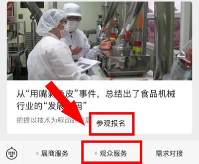 方法三:關(guān)注微信公眾號“IFPE食機展”,點擊下方菜單欄“觀眾服務(wù)”--“參觀報名”即可進入報名系統(tǒng)。