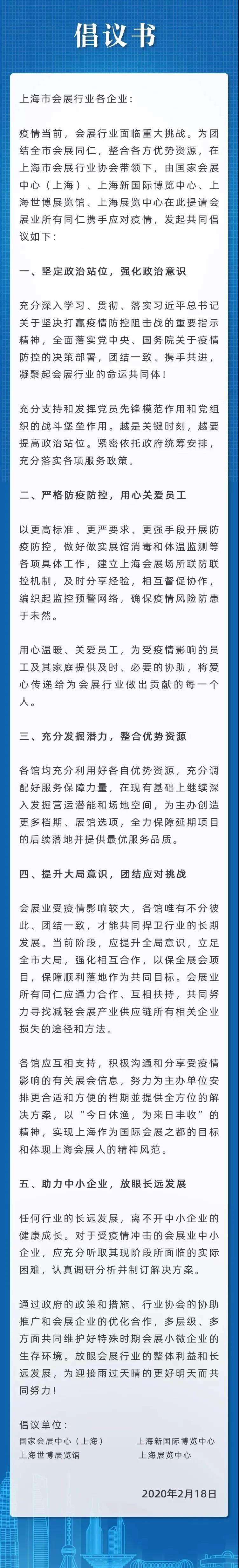與此同時,一份由國家會展中心(上海)提議、上海展覽業(yè)協(xié)會指導(dǎo),上海新國際博覽中心、世博展覽館、上海國際展覽中心昨天共同發(fā)起的倡議書,也向社會公開發(fā)布。《倡議書》明確“不讓任何一個受延期影響的展覽會因沒有檔期和場地而取消”。