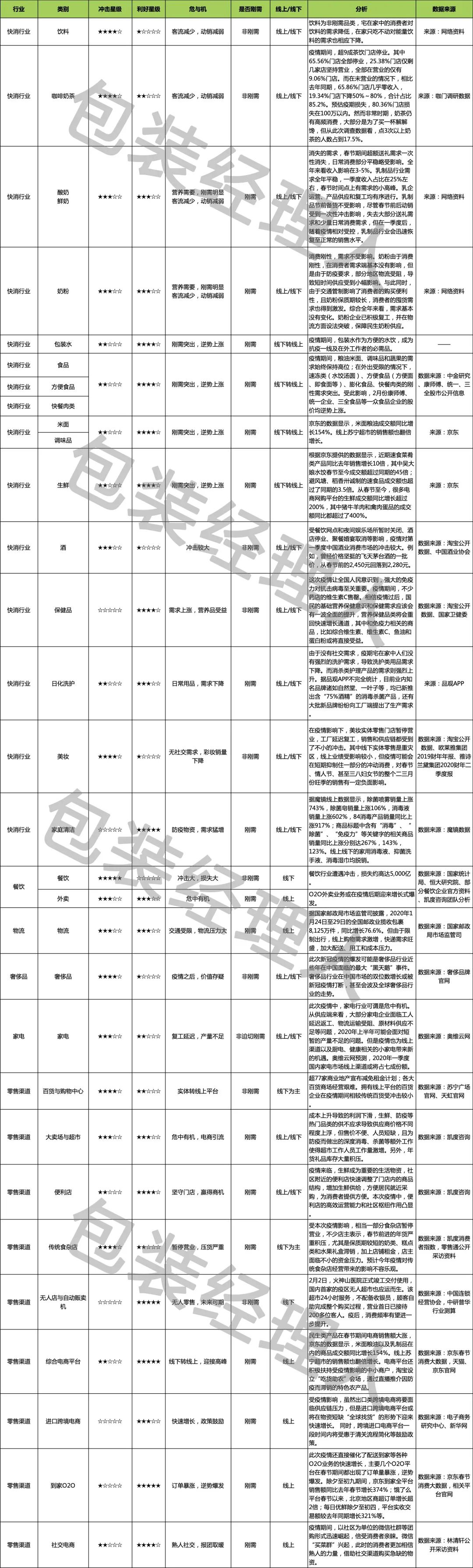 根據(jù)網(wǎng)絡(luò)資料,我們總結(jié)了疫情對(duì)行業(yè)和渠道的影響。從表格中可以看出,受疫情影響嚴(yán)重的是非剛需產(chǎn)品和線(xiàn)下渠道。而在本次疫情中逆勢(shì)上漲的是線(xiàn)上渠道,以及以社交渠道和電商為主的APP和零售店。