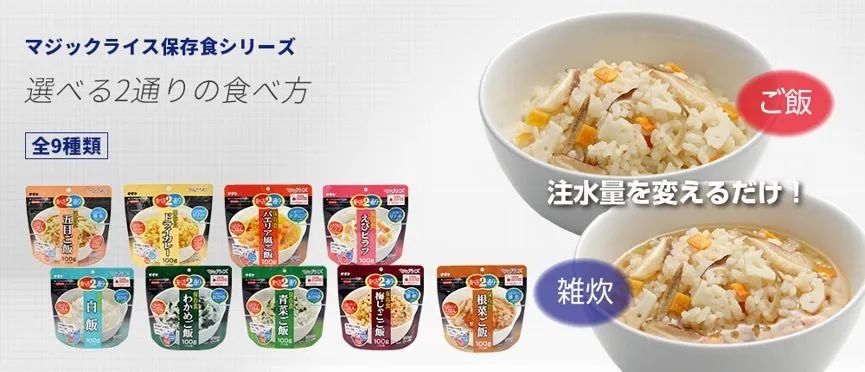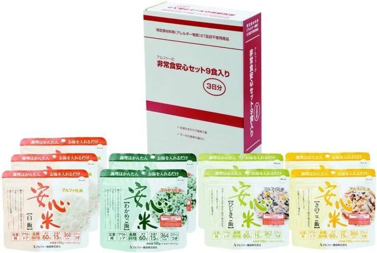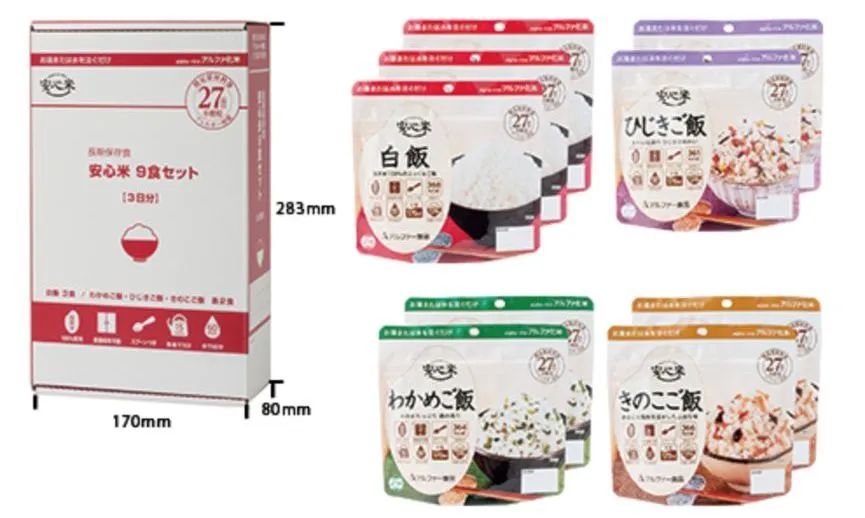 アルファー食品株式會(huì)社為防災(zāi)需要特別推出“安心米”系列,將生米煮熟后立即通過(guò)熱風(fēng)干燥。這款安心米包裝,達(dá)到可以?xún)?chǔ)存5年的效果,袋裝方便攜帶,盒裝則便于直接加熱水沖泡。
