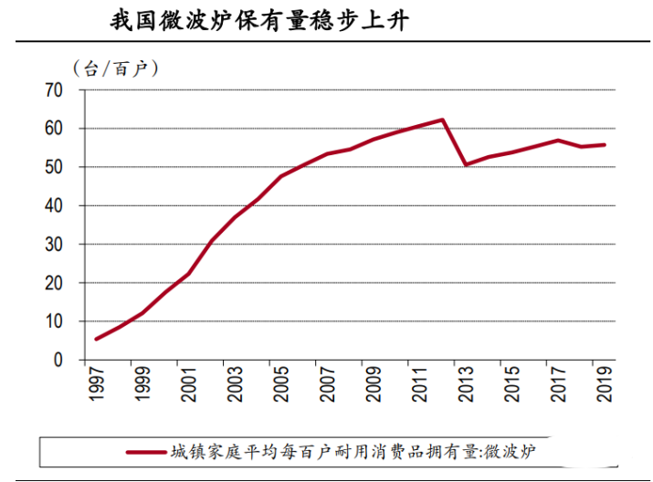 在2019年,我國城鎮(zhèn)微波爐保有量為 55.73 臺/百戶,保有量穩(wěn)步上升,方便、快捷的加熱功能使得微波爐逐步成為國內(nèi)廚房的必須產(chǎn)品。