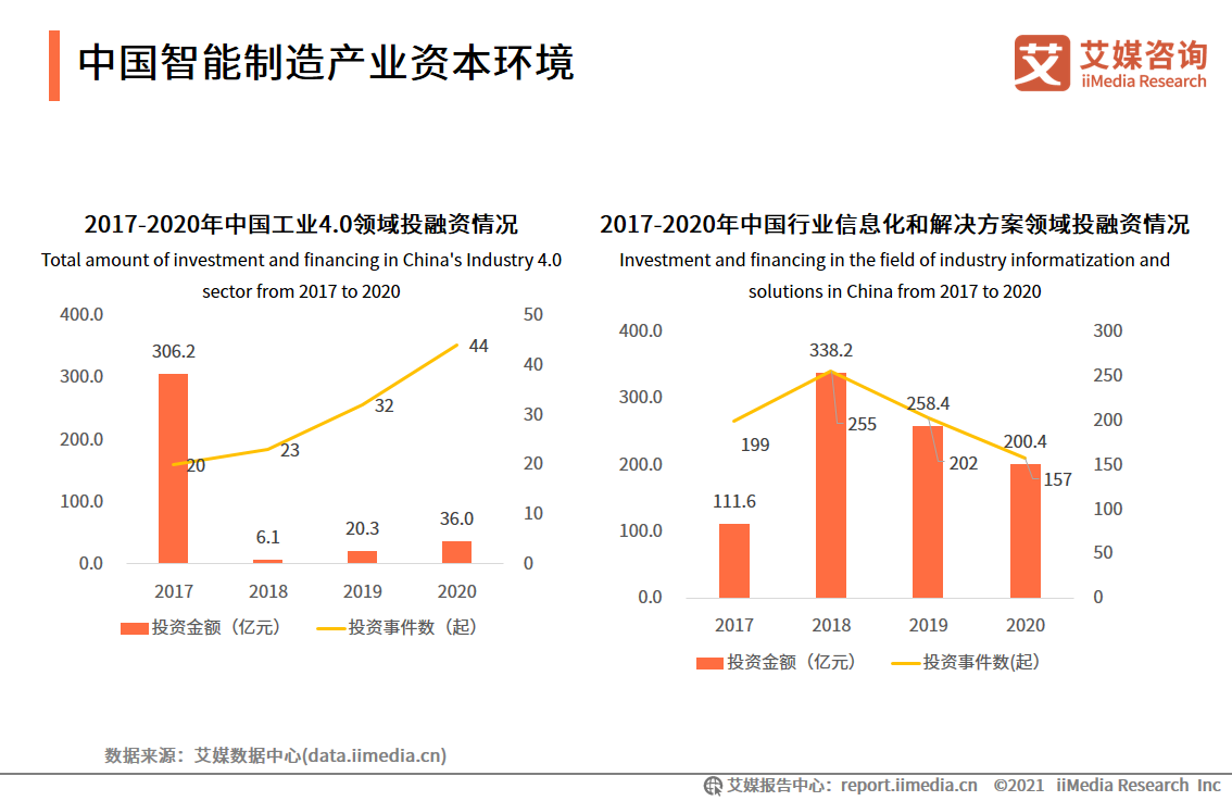 iiMedia Research(艾媒咨詢)數(shù)據(jù)顯示,中國工業(yè)4.0的投資金額和投資事件數(shù)從2018年的6.1億元和23起回暖至2020年的36.0億元和44起;而中國行業(yè)信息化和解決方案領(lǐng)域投融金額和數(shù)量從2018年338.2億元和255起逐步減至200.4億元和157起。資本在工業(yè)4.0領(lǐng)域的投資逐漸回歸理性,已經(jīng)建成護城河的企業(yè)將更受資本青睞;而中國行業(yè)信息化和解決方案領(lǐng)域已具一定成熟度,融資目的將更加集中于增加企業(yè)核心優(yōu)勢。