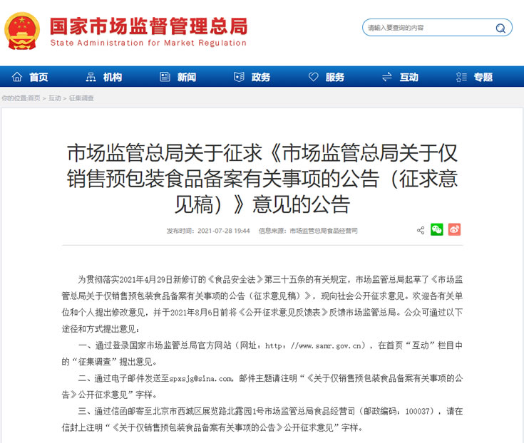 7月28日,市場(chǎng)監(jiān)管總局發(fā)布《關(guān)于僅銷售預(yù)包裝食品備案有關(guān)事項(xiàng)的公告(征求意見稿)》,擬對(duì)僅銷售預(yù)包裝食品的食品經(jīng)營者備案有關(guān)事項(xiàng)進(jìn)行統(tǒng)一規(guī)范。