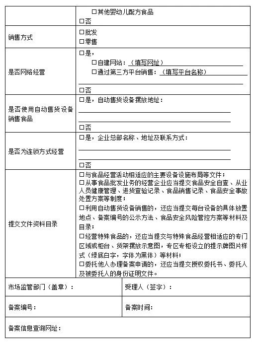 一、合法的市場(chǎng)主體從事僅銷售預(yù)包裝食品活動(dòng),應(yīng)當(dāng)自訂購食品準(zhǔn)備銷售之日起到正式銷售前,向經(jīng)營場(chǎng)所所在地縣級(jí)市場(chǎng)監(jiān)管部門備案。已取得食品經(jīng)營許可證的,食品經(jīng)營許可證在有效期屆滿前繼續(xù)有效,無需備案;許可證有效期屆滿繼續(xù)經(jīng)營的,應(yīng)當(dāng)在食品經(jīng)營許可證有效期屆滿前進(jìn)行備案。僅銷售預(yù)包裝食品的食品經(jīng)營者備案后,增加其他食品經(jīng)營項(xiàng)目的,應(yīng)當(dāng)依法取得食品經(jīng)營許可,并同時(shí)撤銷備案。不同市場(chǎng)主體不得使用同一經(jīng)營場(chǎng)所從事僅銷售預(yù)包裝食品經(jīng)營活動(dòng)和備案。在不同經(jīng)營場(chǎng)所從事僅銷售預(yù)包裝食品經(jīng)營活動(dòng)的,應(yīng)當(dāng)分別備案。