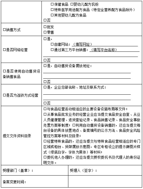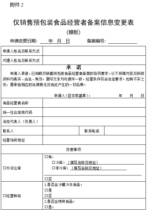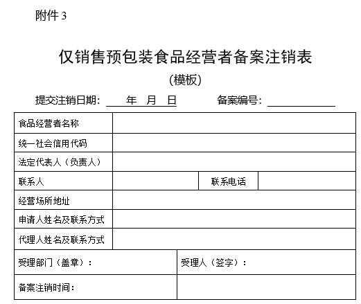 二、從事僅銷售預(yù)包裝食品活動(dòng)的食品經(jīng)營者應(yīng)當(dāng)具備與銷售的食品品種、數(shù)量等相適應(yīng)的經(jīng)營條件。備案時(shí),食品經(jīng)營者應(yīng)當(dāng)填寫《僅銷售預(yù)包裝食品備案信息采集表》,并提交相關(guān)文件資料及目錄。備案信息發(fā)生變化的,應(yīng)當(dāng)自發(fā)生變化之日起15個(gè)工作日內(nèi)向原實(shí)施備案的市場(chǎng)監(jiān)管部門提交《僅銷售預(yù)包裝食品備案信息變更表》、與變更項(xiàng)目有關(guān)的文件資料和目錄進(jìn)行備案變更。終止食品經(jīng)營活動(dòng)的,應(yīng)當(dāng)自經(jīng)營活動(dòng)終止之日起15個(gè)工作日內(nèi),向原備案的市場(chǎng)監(jiān)管部門注銷備案。未及時(shí)注銷備案的,市場(chǎng)監(jiān)管部門可注銷備案。食品經(jīng)營者主體資格依法終止的,備案自動(dòng)失效。