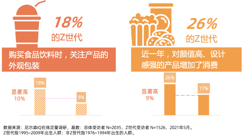 尼爾森IQ調(diào)研數(shù)據(jù)顯示,相比非Z世代,受訪者中Z世代有明顯的“顏控”傾向,在選購(gòu)食品飲料產(chǎn)品時(shí),他們比非Z世代人群更加關(guān)注產(chǎn)品的包裝外觀。近一年,他們?cè)诎b顏值高、設(shè)計(jì)感強(qiáng)的食品飲料產(chǎn)品上增加消費(fèi)的比例顯著高于非Z世代受訪群體。對(duì)于食品飲料品牌來(lái)說(shuō),抓住Z世代的味蕾重要,吸引他們的眼球也很重要。