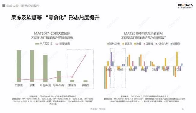 伴隨著消費(fèi)升級(jí),功能性食品呈現(xiàn)出消費(fèi)人群年輕化、產(chǎn)品形態(tài)多樣化的特點(diǎn)。根據(jù)CBNData《年輕人養(yǎng)生消費(fèi)趨勢(shì)報(bào)告》顯示,超過(guò)九成的年輕人具有養(yǎng)生意識(shí),90后及Z世代在功能食品中的消費(fèi)占比逐年升高,軟糖型、果凍型等形態(tài)增速明顯。
