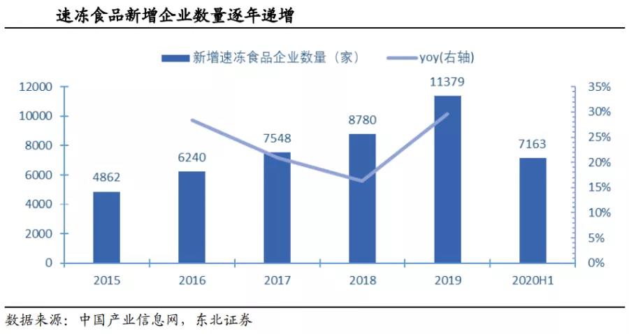 2020 年上半年國內新增速凍食品企業(yè) 7163 家,已達 2019 年全年新增數(shù)量的 63%。我國速凍食品企業(yè)數(shù)量呈現(xiàn)不斷增加的發(fā)展態(tài)勢,行業(yè)發(fā)展勢頭強勁。