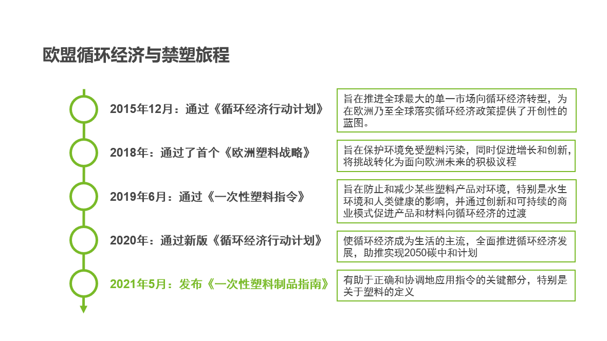當(dāng)我們回溯歐盟的相關(guān)法令可以發(fā)現(xiàn),從2015年的《循環(huán)經(jīng)濟行動計劃》到《歐洲塑料戰(zhàn)略》、《一次性塑料法令》等等,對塑料的使用、限制都在一步步加強,歐盟通過推廣環(huán)保新材料、開征塑料稅、制定碳中和目標(biāo)、重新定義塑料范疇等不同方式,力圖對塑料的生產(chǎn)、使用、消費、回收形成一個閉環(huán)的管理和引導(dǎo)。