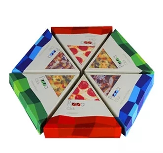 異型包裝。不是所有的產(chǎn)品都只能放在四方盒里,不同的尺寸和形狀往往能給產(chǎn)品打造獨特的外觀。Slice Pizzeria是一家來自韓國的披薩公司,他們制造的披薩都切片裝好在三角形的盒子里,集齊口味還能拼成一個六邊形,既方便堆放又獨具品牌個性。