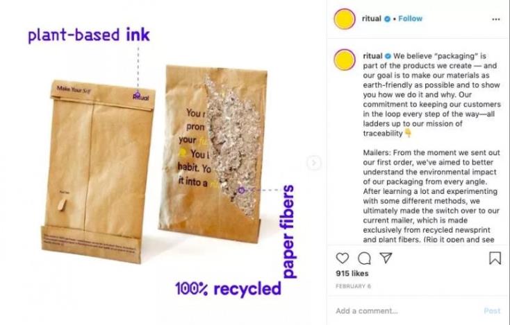 植物/大豆油墨用于食品包裝的印刷,其原料通常源于玉米或大豆等有機化合物。這種植物基油墨與普通的膠印油墨相比更容易脫墨,經(jīng)由脫墨處理的植物油墨殘渣更容易在自然環(huán)境下降解,對于水資源的污染也小。美國一家維生素產(chǎn)品制造商Ritual宣布從2021年4月開始,他們的產(chǎn)品快遞將完全由環(huán)保紙張和再生纖維作為原料,甚至包裝袋字體的打印也采用植物性墨水。