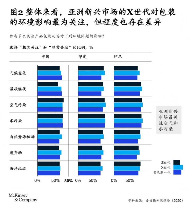 當(dāng)深入研究第二個(gè)問(wèn)題,探究是哪個(gè)群體在助推這些擔(dān)憂時(shí),我們發(fā)現(xiàn)所有受訪年齡群體都很關(guān)注這些問(wèn)題。整體來(lái)看,X世代的關(guān)注程度最高,其次是Z世代/千禧一代和嬰兒潮一代(見(jiàn)圖2)。具體到空氣和水污染這兩個(gè)主要領(lǐng)域,印尼的X世代對(duì)此尤其關(guān)注,而中國(guó)和印度的情況差異較大。