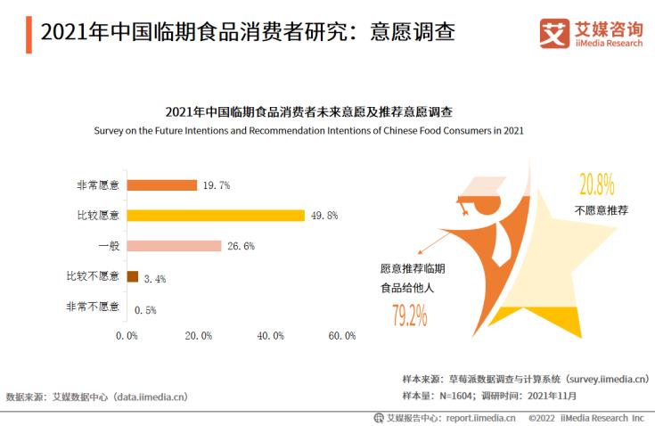 數(shù)據(jù)顯示,有69.5%的中國(guó)臨期食品消費(fèi)者表示,未來(lái)愿意繼續(xù)購(gòu)買;近八成的臨期食品消費(fèi)者表示愿意向他人推薦。艾媒咨詢分析師認(rèn)為,中國(guó)臨期食品消費(fèi)者對(duì)臨期食品的消費(fèi)意愿較為強(qiáng)烈,高性價(jià)比的特點(diǎn)吸引消費(fèi)者進(jìn)行消費(fèi),并且愿意向他人推薦此類高性價(jià)比的產(chǎn)品。