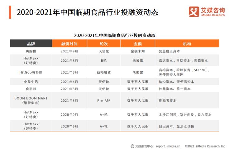 中國(guó)臨期食品賽道已有“好特賣”“繁榮集市”“小象生活”“甩甩賣”“好食期”等多個(gè)品牌出現(xiàn)。2021年臨期食品行業(yè)引起資本關(guān)注,行業(yè)內(nèi)“好特賣”、“繁榮集市”等品牌獲得融資。