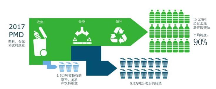 雖然在過去幾年中,在食品包裝的生態(tài)設(shè)計和回收技術(shù)方面取得了相當(dāng)大的進(jìn)步,但包裝的回收率,特別是塑料和復(fù)合包裝的回收率仍然相對較低。例如,在美國,食品和餐飲塑料包裝回收利用率約為 14%。報告發(fā)現(xiàn),擴(kuò)大包裝回收利用規(guī)模的主要障礙不僅是當(dāng)?shù)氐脑偕媚芰?,還取決于收集和分類等基礎(chǔ)設(shè)施條件,而這些條件在世界上許多國家還很不成熟。即使很多城市政府要求民眾在源頭進(jìn)行垃圾分類,但錯誤分類和嚴(yán)重污染也使得收集來的包裝廢棄物無法被再生處理,只能從再生過程中被剔除并填埋或焚燒。提高實際回收率,是整個歐盟面臨的挑戰(zhàn)。