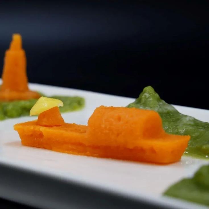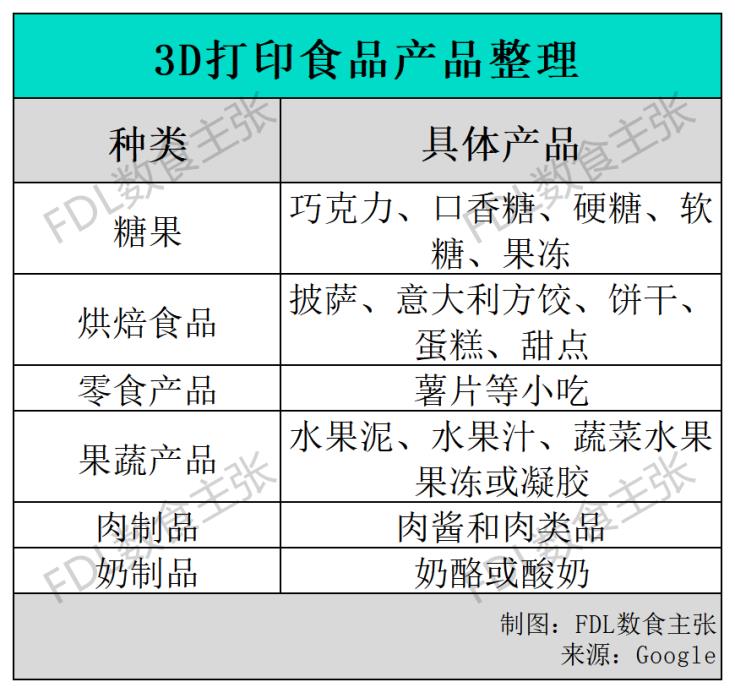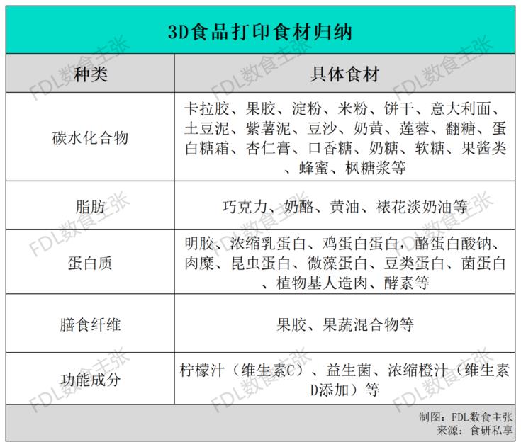 目前,3D食品打印所用到的食材可以從組成成分的角度,大致歸納為五大類:碳水化合物、脂肪、蛋白質(zhì)、膳食纖維以及功能成分,F(xiàn)DL數(shù)食主張選取了以下海內(nèi)外代表性案例展開(kāi)介紹: