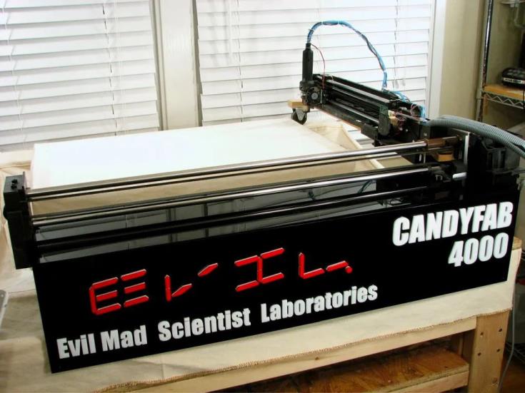 于是乎,從2007至2009年,位于美國(guó)加州的一個(gè)小型機(jī)械實(shí)驗(yàn)機(jī)構(gòu)Evil Mad Scientist Laboratories就成功建造出三臺(tái)DIY 3D打印機(jī)CandyFab 4000、5000和6000。據(jù)悉,CandyFab系列機(jī)器能夠使用一種稱為選擇性熱空氣燒結(jié)和熔化 (SHASAM) 的新工藝,通過(guò)將糖粒與熱空氣一起熔化,從而在低成本下用純糖打印出食品。