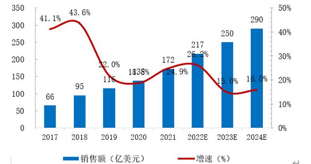 根據(jù)IFR數(shù)據(jù),2021年全球服務(wù)機器人市場規(guī)模達到172億美元,預(yù)計到2022年將增長至217億美元,至2024年增長至290億美元,如下圖所示。疫情催生了對專業(yè)服務(wù)應(yīng)用的新需求,形成初具規(guī)模的行業(yè)