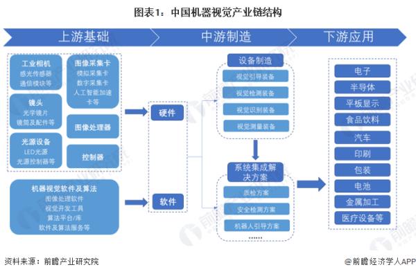 機(jī)器視覺行業(yè)的上游有光源、鏡頭、工業(yè)相機(jī)、圖像采集卡、機(jī)器視覺軟件等的提供商。行業(yè)下游應(yīng)用較廣,主要下游市場(chǎng)是半導(dǎo)體和電子制造行業(yè)。除此之外還有應(yīng)用到汽車、印刷包裝、農(nóng)業(yè)、醫(yī)療設(shè)備和金屬加工等領(lǐng)域。
