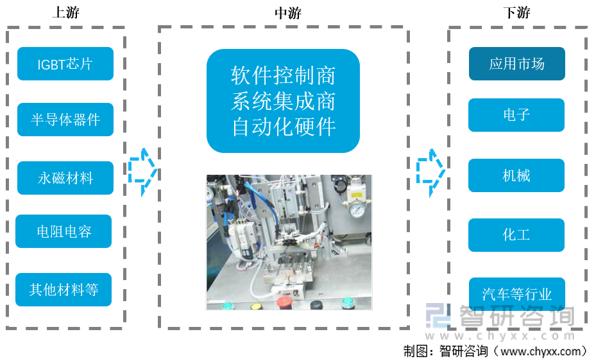 工業(yè)自動化是20世紀(jì)以來現(xiàn)代制造領(lǐng)域中最重要的核心技術(shù)和產(chǎn)業(yè)之一,其涉及電力、電子、計算機(jī)、人工智能、通訊、機(jī)電等諸多領(lǐng)域,需運(yùn)用控制理論、儀器儀表、計算機(jī)信息技術(shù)等先進(jìn)技術(shù),屬于綜合學(xué)科產(chǎn)業(yè),具有技術(shù)密集、高投入和高效益等顯著特征,是典型的高附加值產(chǎn)業(yè)。工業(yè)自動化的應(yīng)用可使工廠的生產(chǎn)和制造過程更加自動化、效率化、精確化,并具有可控性及可視性,從而達(dá)到增加產(chǎn)量、提高質(zhì)量、降低消耗、確保安全等目的。工業(yè)自動化就是工業(yè)生產(chǎn)中的各種參數(shù)為控制目的,實(shí)現(xiàn)各種過程控制,在整個工業(yè)生產(chǎn)中,盡量減少人力的操作,而使工業(yè)能進(jìn)行自動生產(chǎn)。自動控制系統(tǒng)是實(shí)現(xiàn)自動化的主要手段,主要由控制器、被控對象、執(zhí)行機(jī)構(gòu)和變送器四個環(huán)節(jié)組成。工業(yè)自動化行業(yè)的原材料主要有電子元器件、機(jī)械件、非標(biāo)加工件及其他產(chǎn)品。工業(yè)自動化行業(yè)產(chǎn)業(yè)鏈上游主要是自動化軟件、硬件制造商,主要包括可編程邏輯控制器(PLC)、伺服系統(tǒng)、步進(jìn)系統(tǒng)、變頻器、人機(jī)界面(HMI)、傳感器、數(shù)據(jù)采集與監(jiān)視控制系統(tǒng)(SCADA)、制造執(zhí)行管理系統(tǒng)(MES)等工業(yè)自動化產(chǎn)品制造商;中游則是系統(tǒng)集成商和產(chǎn)品分銷商,即根據(jù)下游客戶的工藝需求,提供設(shè)備選型、產(chǎn)品銷售以及將標(biāo)準(zhǔn)化產(chǎn)品集成為可用的自動化控制系統(tǒng)等服務(wù)的提供商;下游則是制造裝備制造商和自動化工廠投資方,包括機(jī)床、電子制造設(shè)備、機(jī)械等領(lǐng)域。