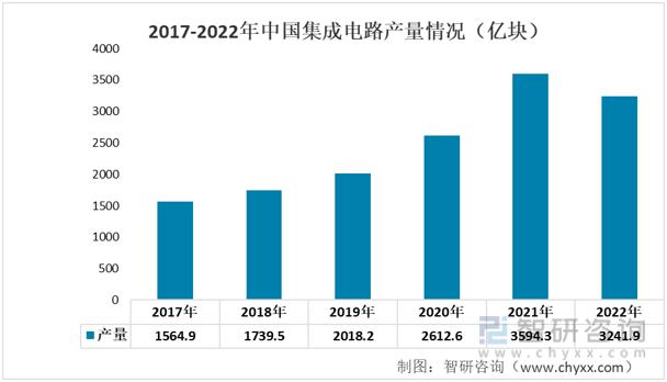 集成電路在消費(fèi)電子、高端制造、網(wǎng)絡(luò)通訊、家用電器、物聯(lián)網(wǎng)等諸多領(lǐng)域得到廣泛應(yīng)用,已成為衡量一個國家產(chǎn)業(yè)競爭力和綜合國力的重要標(biāo)志之一,也是工業(yè)自動化行業(yè)上游重要的原材料。從近年來我國集成電路的產(chǎn)量情況來看,呈現(xiàn)上升的態(tài)勢,集成電路從2017年的1564.9億塊上升至2022年的3241.9億塊。