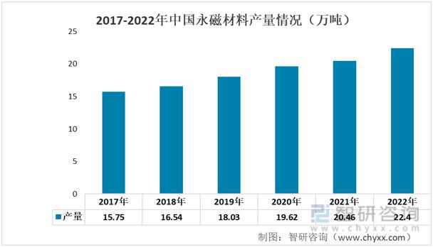 稀土永磁材料是工業(yè)自動化重要的上游原材料。近年來,中國稀土永磁材料產(chǎn)量保持穩(wěn)定增長趨勢。數(shù)據(jù)顯示,我國稀土永磁材料產(chǎn)量由2017年的15.75萬噸增至2021年的20.46萬噸,預(yù)計2022年我國稀土永磁材料產(chǎn)量將增長至22.4萬噸。