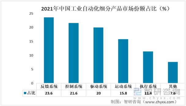 從2021年年中國工業(yè)自動化細(xì)分產(chǎn)品市場份額占比情況來看,反饋系統(tǒng)、控制系統(tǒng)、驅(qū)動系統(tǒng)占比分別為23.6%、21.6%、20%,運(yùn)動系統(tǒng)、執(zhí)行系統(tǒng)占比分別為15.8%、11.4%。