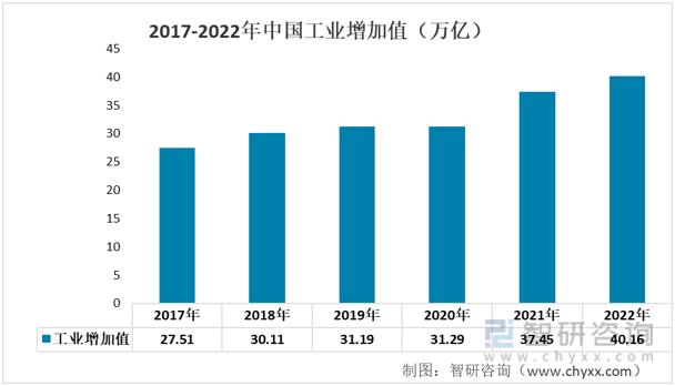 工業(yè)增加值能在一定程度商覺得工業(yè)自動化行業(yè)的景氣度。近年來隨著我國綜合實(shí)力不斷提升,我國工業(yè)增加值呈現(xiàn)上升的態(tài)勢,2017年我國工業(yè)增加值為27.51萬億,2022年工業(yè)增加值為40.16萬億元。